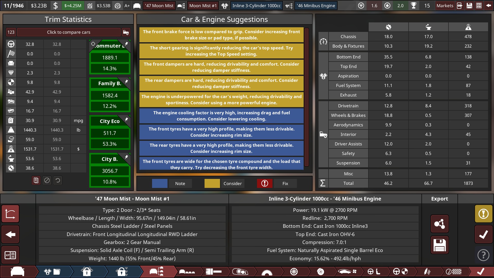 While I would prefer to produce a V8 or something in a small factory for premium cars, the engineering time for fancier engines means a longer period of not producing. I can get engineering + tooling down to 4 months or less on the preexisting factories, whereas a 1000cc V8 takes much longer even though it works for Light Sports and such vehicles which would be better for a tiny-small factory to make. I plan to switch the small factories to premium builds once I had a larger engine factory producing the 3-Cylinder 1000cc budget motor to reduce costs and increase affordability through scale of production.